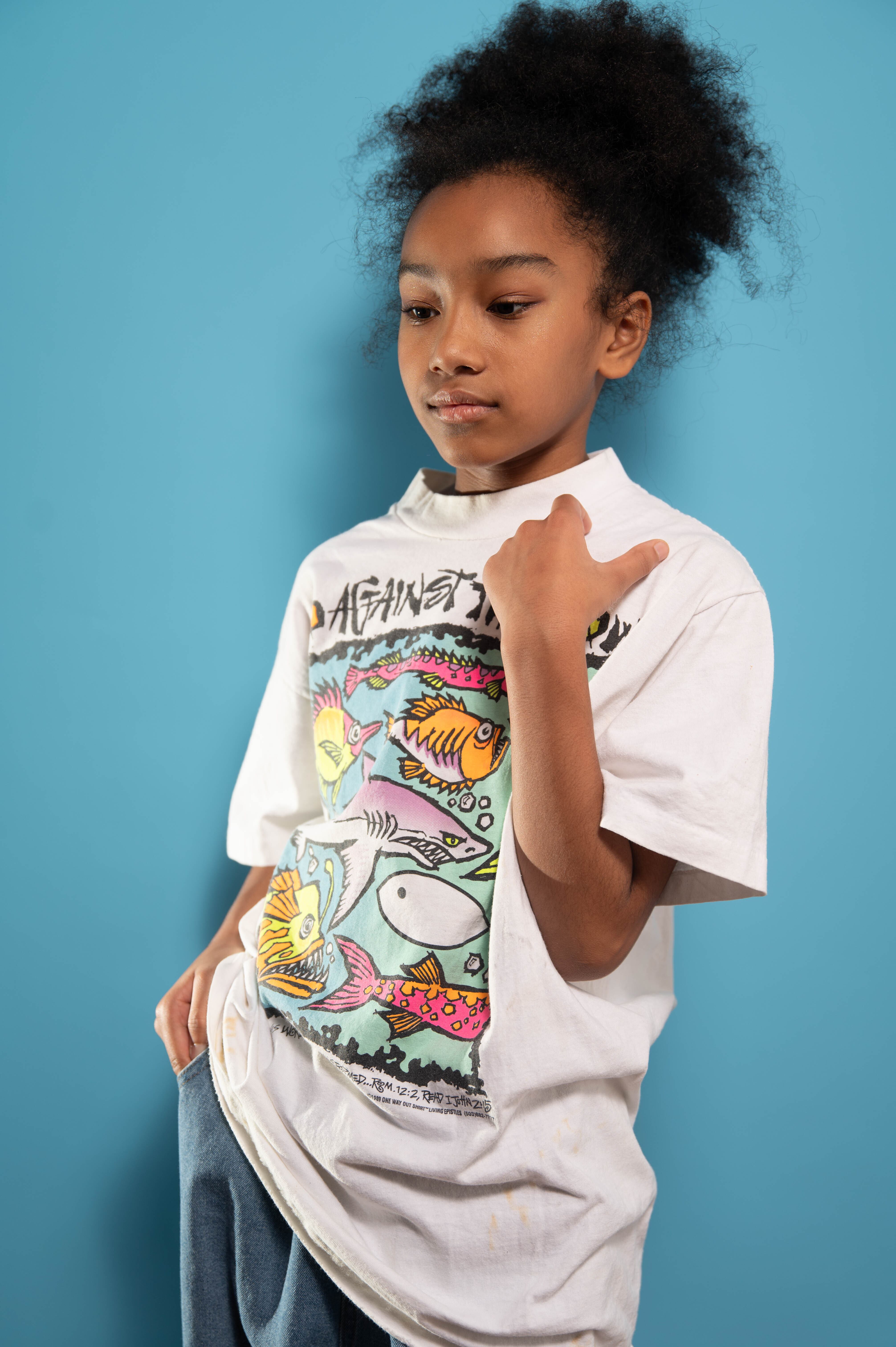 ポップなフィッシュ柄プリントTシャツ。カラフルなさかなが特徴的なデザインで、誰でも楽しめる楽しい一着です。目を引く印象を与え、カジュアルなコーディネートにぴったりです!