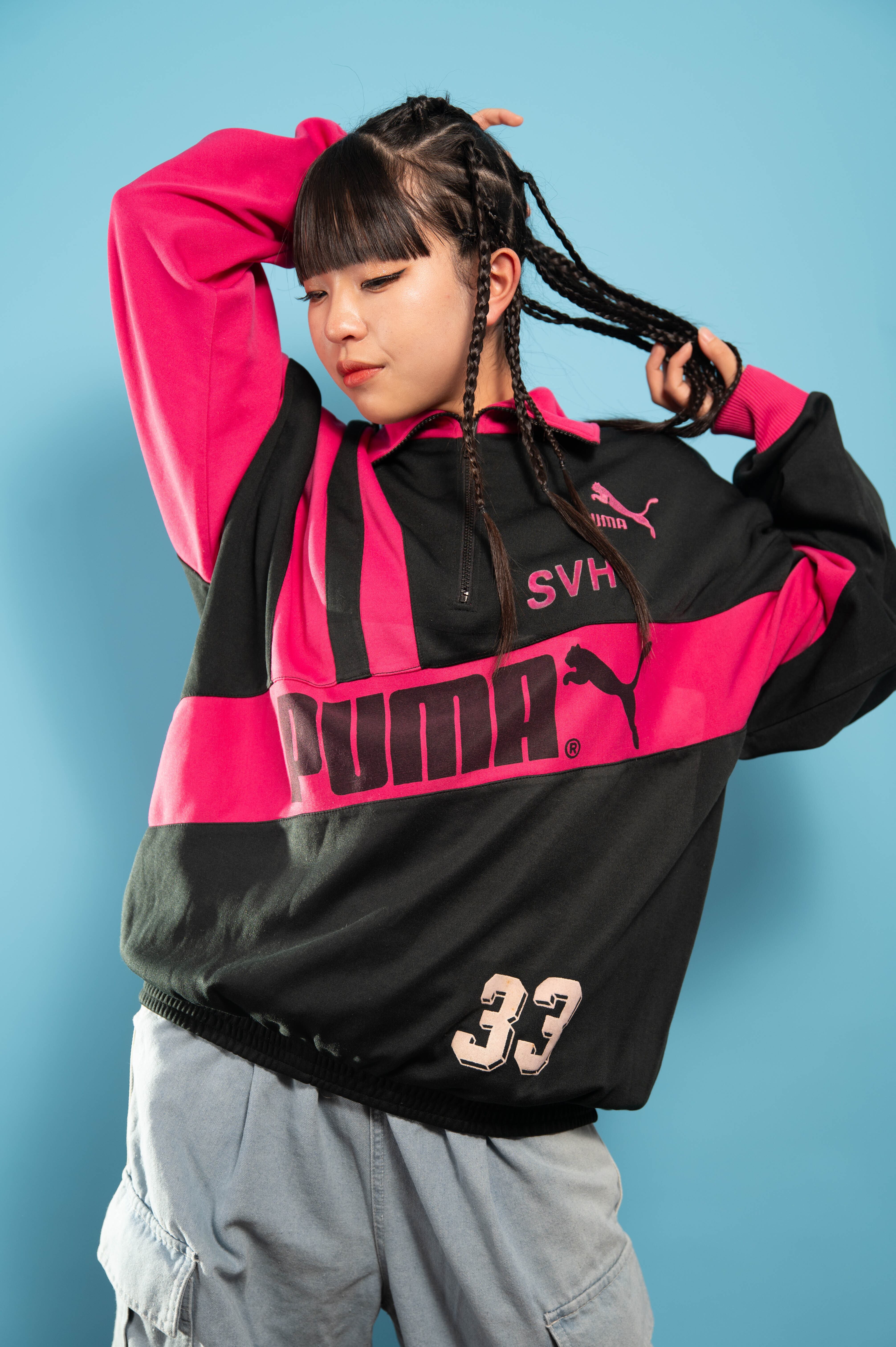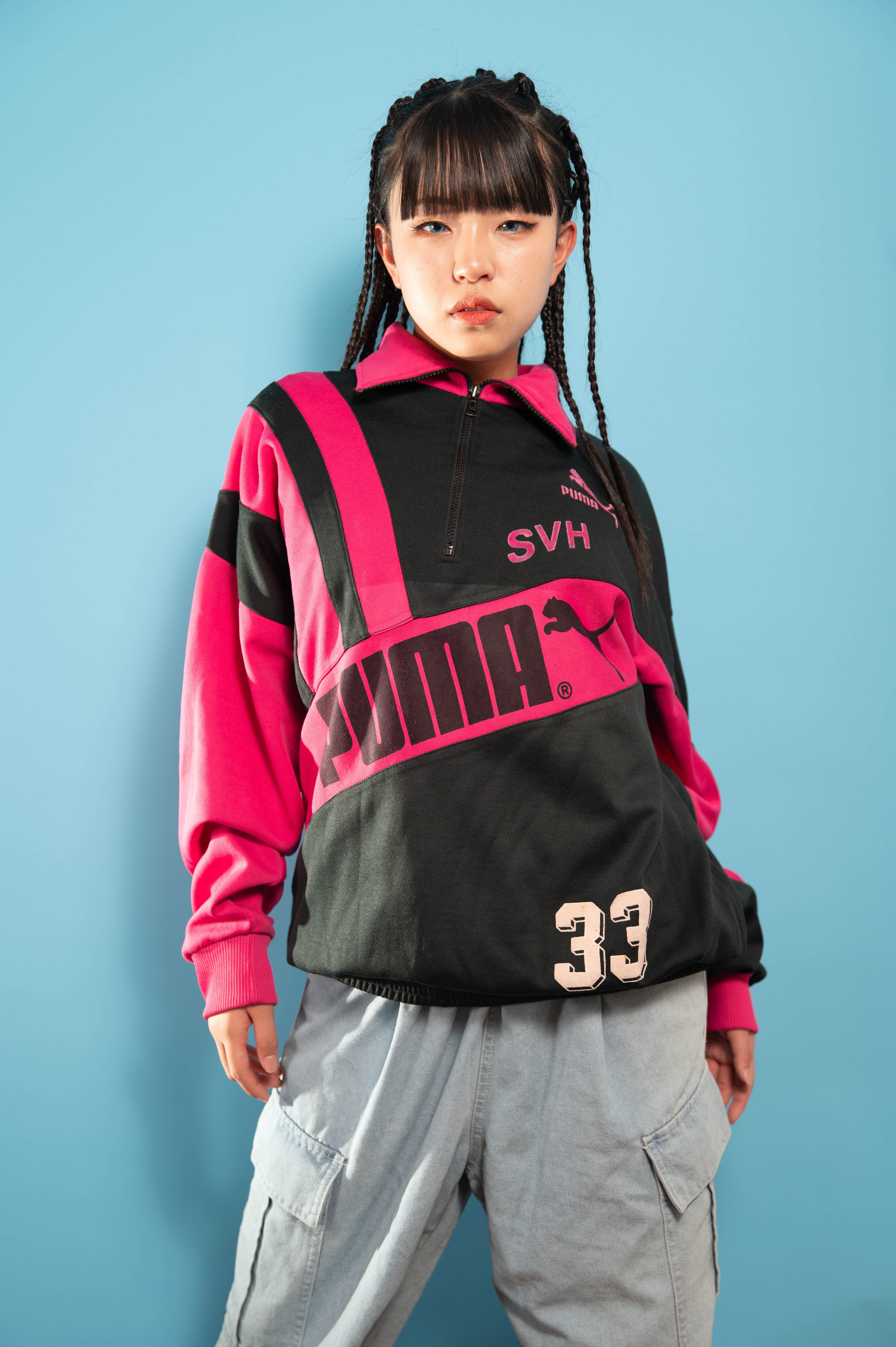 90s PUMAトラックジャケット。ジャージ素材を使用したこのトラックジャケットは、黒地に映えるピンクのコンビネーションが特徴的。