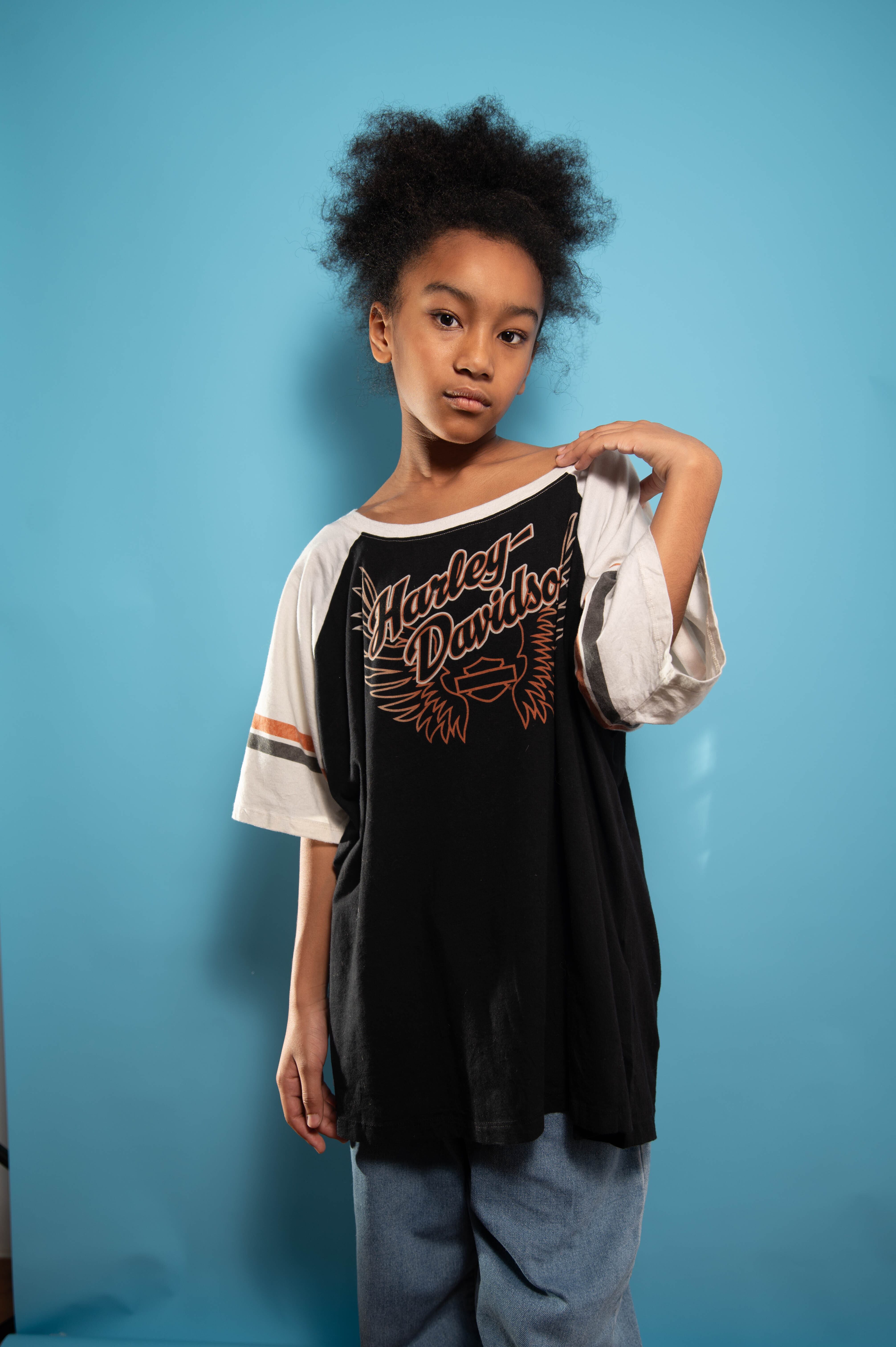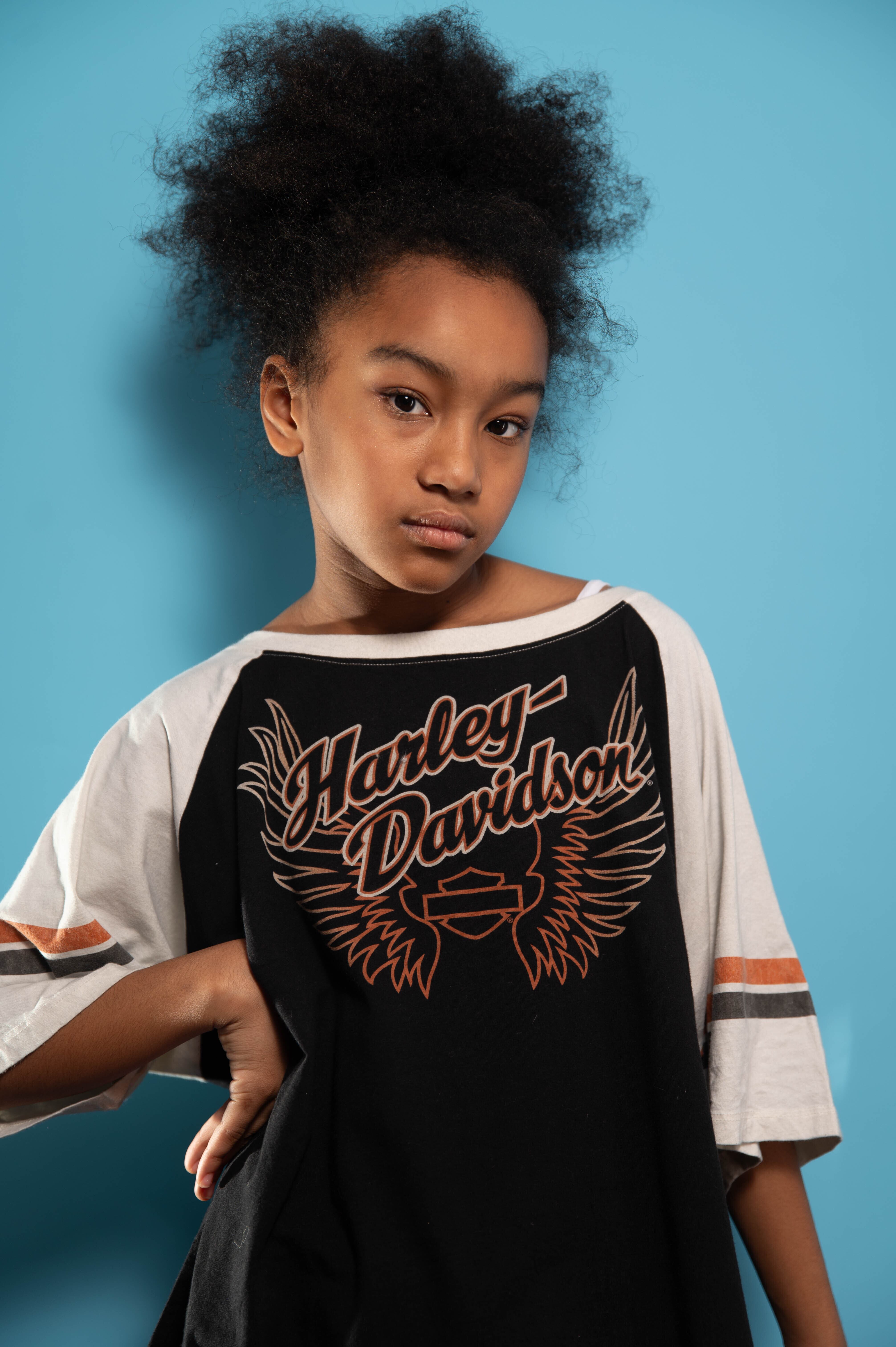 黒と白の切り返しでボディにハーレーのロゴがプリントされた五分袖丈Tシャツ。ヴィンテージ感もあり一世を風靡した「アメカジ」を彷彿とさせる